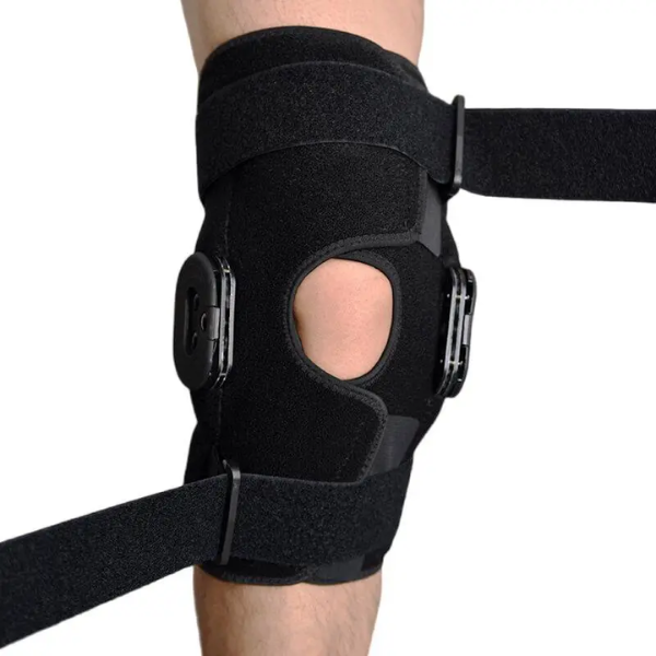 - The brace typically includes hinges that allow for controlled movement of the knee joint, while also preventing it from bending or twisting beyond a specific range of motion.